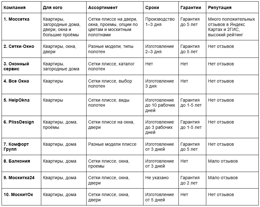 Сравнительная таблица поставщиков сеток плиссе.