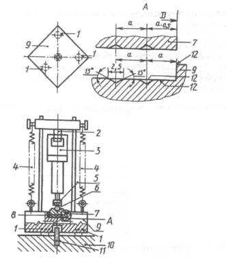 | 1 - диски из синтетической резины или материала с подобными свойствами твердостью по Шору А от 70 до 80, толщиной 2 - облицованная полиамидом скоба, пригнанная к рукоятке машины; 3 - машина; 4 - механический пружинный или пневматический механизм, создающий нажим на машину; 5 - пуансон; 6 - шар из закаленной стали диаметром |