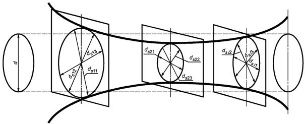 Средний диаметр отверстия детали в единичной плоскости представляет собой среднеарифметическое значение максимального и минимального диаметров в любой единичной плоскости, как представлено в следующих уравнениях (таблица A.2). Этот параметр в каждой единичной плоскости имеет одно значение.