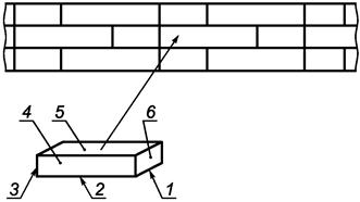 1 - ширина; 2 - длина; 3 - толщина; 4 - ложок; 5 - постель; 6 - тычок