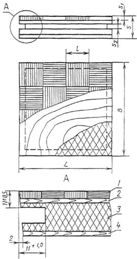 1 - квадраты лицевого покрытия; 2, 4 - лущеный шпон; 3 - ДСП (ЦСП)