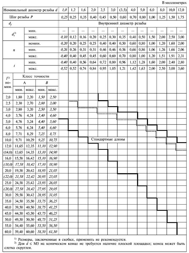 2) Угол 90° относится только к части конца ниже внутреннего диаметра резьбы винтов с номинальными длинами l, приведенными ниже штриховой ступенчатой линии в таблице 1.