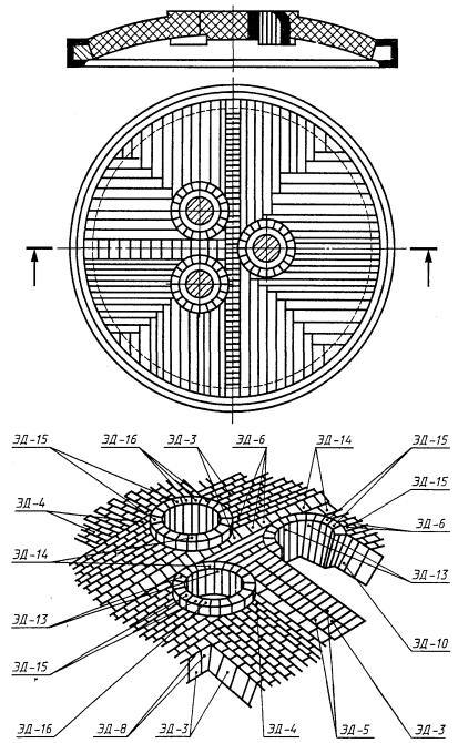 | 6 | 300 | 150 | 65 | 55 | Для кладки междуэлектродных арок и сводов толщиной 300 в сочетании с прямым изделием № 3 и для кладки секторных рядов свода в сочетании с клиновым изделием № 10 |