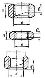 | Внутренняя | 6Н | 6Н | 7Н | 1. Для гаек от МЗ высотой m ³ 0,8d допуски внутреннего диаметра должны быть выдержаны на участке т1³ 0,5т 2. Для гаек высотой 0,5d £ m < 0,8d допуски внутреннего диаметра должны быть выдержаны на участке т2 ³ 0,35т 3. У самоконтрящихся гаек внутренний диаметр может превышать допустимые значения на участке т3 £ 0,35т от нагруженного торца |