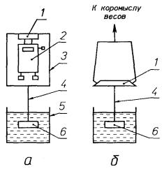 1 - чашкавесов; 2 - квадрантные или электронные весы; 3 - рамка подвеса; 4- нить подвеса металлическая; 5 - сосуд для гидростатическоговзвешивания; 6 - стакан с образцом