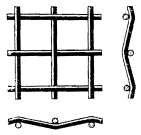 | Переплетение плоских спиралей, образующих квадратную ячейку | Сетка характеризуется размером стороны ячейки в свету и диаметром проволоки. За размер стороны ячейки в свету принимается расстояние между противоположными проволоками, образующими ячейку | От 10 до 100 | От 1,6 до 5,0 | Стальная термически необработанная низкоуглеродистая (без покрытия, оцинкованная, покрытая пластиком) и высоколегированная проволока | Для ограждения - крепления горных выработок, для разделения сыпучих тел по крупности |