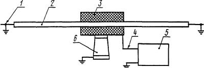 1 - токопроводящая жила или металлический покровкабельного изделия; 2 - изоляция, оболочка или защитный шланг; 3- электрод; 4 - высоковольтный вывод, 5 - установка; 6 -изолятор