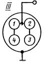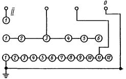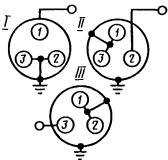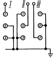 | 9 | Многожильный троечной скрутки | Жилы каждой группы, соединенные вместе, против остальных групп, соединенных вместе. Группу жил составляют все жилы 1, соединенные вместе, все жилы 2, соединенные вместе, и все жилы 3, соединенные вместе I - схема испытания первой группы жил против второй и третьей групп, соединенных вместе; II - аналогично, вторая группа жил против первой и третьей; III - третья группа жил против первой и второй | Жилы каждой группы, соединенные вместе, против жил остальных групп, соединенных вместе и с внешним заземленным электродом | ||