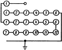 | 5 | Многожильный (свыше 4 жил) с одинарными жилами | Все жилы, разделенные поочередно на три группы, присоединены к отдельным фазам испытательной установки, а внешний электрод к нулевому зажиму. В случае многоповивных кабельных изделий все, соединенные вместе жилы 1 повива, затем жилы смежных повивов присоединены последовательно к фазам испытательной установки, а внешний электрод к нулевому зажиму. Если число жил в повиве составляет 3п+1, то последнюю жилу повива присоединяют к фазе, к которой присоединена жила 3п-1 | ||