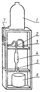 Установка для определенияводяных паров (черт. 4)состоит: из двух трубок TX-U 1, заполненных смесью,состоящей из 50 % прокаленного асбеста (температура прокаливания не выше 250°С) и 50 % фосфорного ангидрида (по массе); склянки 2, наполненной серной кислотой на