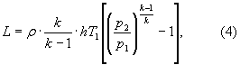 где r - плотность воздуха на входе в вентилятор или пневматическую турбину вентилятора, кг/м3; k - показатель адиабаты; h - газовая постоянная воздуха, Дж/(кг К); T1 - температура сжатого воздуха на входе в пневматическую турбину вентилятора, К; p1 - абсолютное полное давление сжатого воздуха на входе в пневматическую турбину вентилятора, кПа; p2 - абсолютное полное давление воздуха на выходе из вентилятора или пневматической турбины вентилятора, кПа |