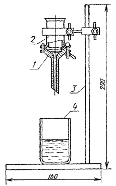 1- тканевый фильтр,установленный в цилиндре; 2 - полыйдвухсекционный цилиндр с коническим дном; 3 - лабораторный штатив; 4 - стаканчик для взвешивания по ГОСТ25336-82