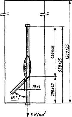 Е.4.2 Горелка должна бытьрасположена следующим образом. Ось горелки должна составлять угол 45° с осью образца. Расстояние между центромвыхода горелки и поверхностью образца, измеренное вдоль оси горелки, должнобыть (10 ± 1) мм. Расстояние отточки пересечения оси горелки и оси образца до точки прикрепления груза должнобыть (100 ± 10) мм. Расстояние от точкипересечения осей горелки и образца до нижней части верхней крепежной системы недолжно превышать 465 мм.