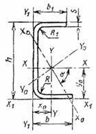 h - высотастенки; b - ширина большей полки; b1 - ширина меньшей полки; s - толщинашвеллера; R и R1 - радиусы кривизны; I - моментинерции; i - радиус инерции; W - момент сопротивления; у0- расстояние от центра тяжести до наружной грани большой полки; x0 - расстояние от центра тяжести до наружнойграни стенки; a- угол наклона главной оси;