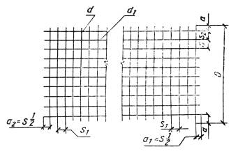 1.1. Ширинасеток b, диаметрпродольных стержней d,диаметр поперечных стержней d1, основной шаг продольных стержней S, основной шагпоперечных стержней S1,доборный шаг продольных стержней S2, свободные концы продольных стержней а1и а2 и свободные концы поперечных стержней а должнысоответствовать указанным на чертеже и табл. 1и 2.