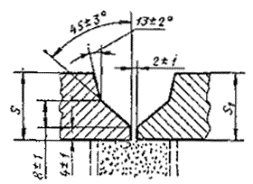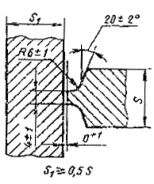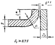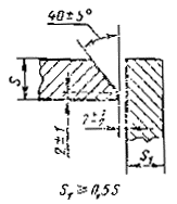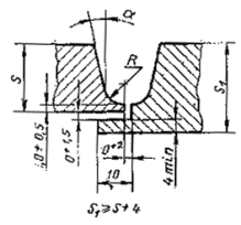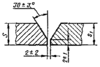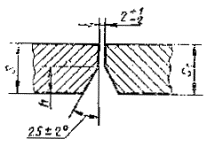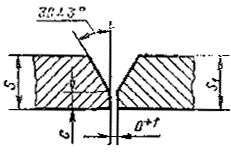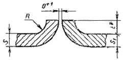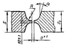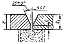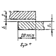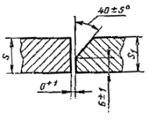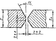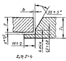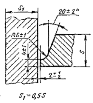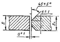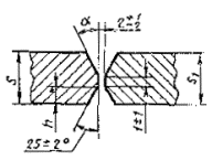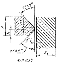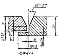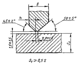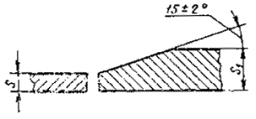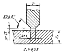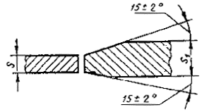 При разнице толщины свариваемых деталей свыше значений, указанных в табл. 53,на детали, имеющей большую толщину s1, должен бытьсделан скос с одной или с двух сторон до толщины тонкой детали s, как указано на черт. 2, 3и 4. При этом конструктивные элементы подготовленныхкромок и размеры сварного шва следует выбирать по меньшей толщине.