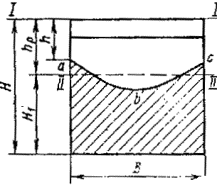 abc - фронт усталостной трещины; I-I - положение визирной линии окуляра микроскопа в начальный моментизмерения (совпадает с гранью образца); II-II - положение визирной линии микроскопа при окончании измерения(положение II-II выбирается так, чтобы заштрихованная площадь выше линии была быравновелика незаштрихованной площади ниже визирной линии)