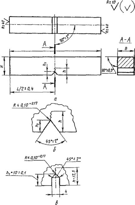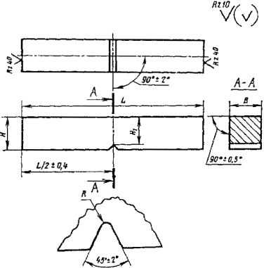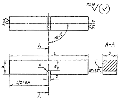 | Радиус концентратора R | Тип образца | Длина L (пред. откл. ±0,6) | Ширина В | Высота Н (пред. откл. ±0,1) | Глубина надреза h1 (пред. откл. ±0,1) | Глубина концентратора h (пред. откл. ±0,6) | Высота рабочего сечения H1 | ||