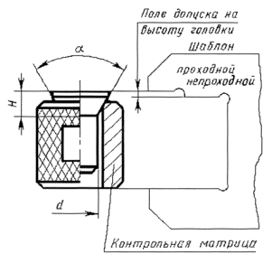 3.7. Отклонение отперпендикулярности опорной поверхности головки к оси стержня проверяют угловым шаблономили щупом по просвету между опорной поверхностью головки и торцевойповерхностью контрольной матрицы.
