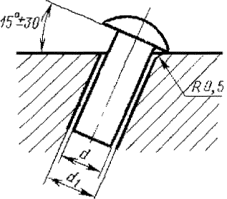заусеницы на головке, еслиих величина не превышает половины поля допуска на диаметр головки заклепки; длязаклепок с диаметром стержня d> 16 мм заусеницы на головках не более 1 мм;