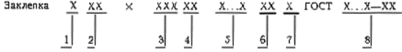 3-длина;4-условное обозначение марки (группы)материала; 5-марка материала.Указывается для групп 01, 03, 21, 38 и для материала, не предусмотренного внастоящем стандарте. Допускается не указывать марку материала для групп 01, 03,21, 38; 6-условное обозначение видапокрытия. Отсутствие покрытия не указывается; 7-толщина покрытия; 8 -обозначение стандарта на конкретный вид заклепок.