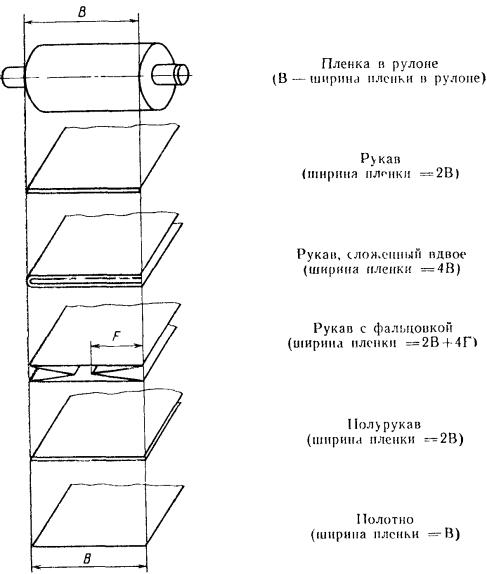 1.3. Пленка выпускаетсясмотанной в рулоны в виде рукава, полурукава (рукав, разрезанный по всей длинес одной стороны), полотна (рукав, разрезанный по всей длине с двух сторон собрезкой или без обрезки кромок), рукава с фальцовкой (со складками), рукава,сложенного вдвое и других видов.
