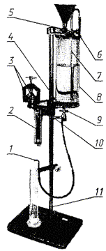 К штативу прикрепленасливная трубка 1, так чтобы ее можно было перемещать вверх и внизпо штативу. Сливная трубка соединена резиновым шлангом с нижней крышкой черезпатрубок, в котором находится кран 9 и регулировочный вентиль 10.
