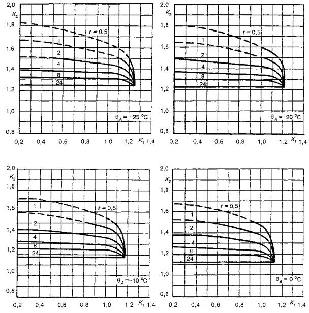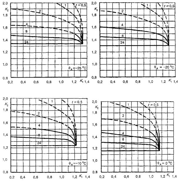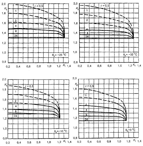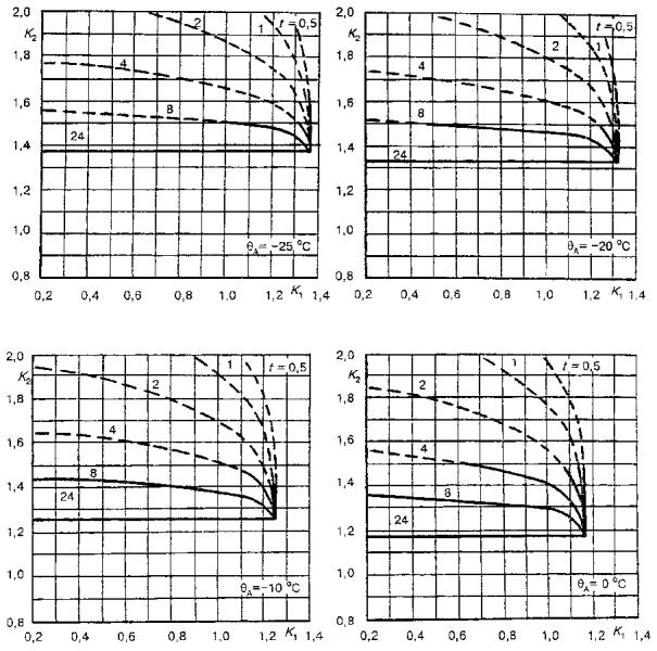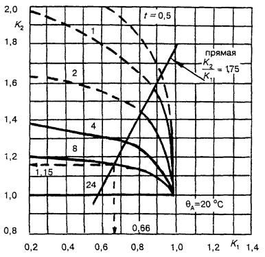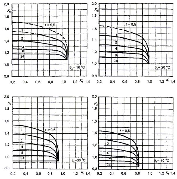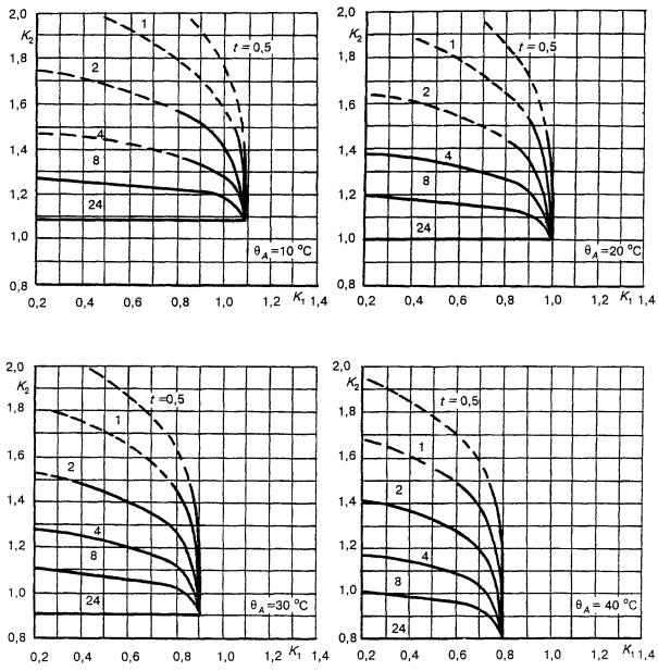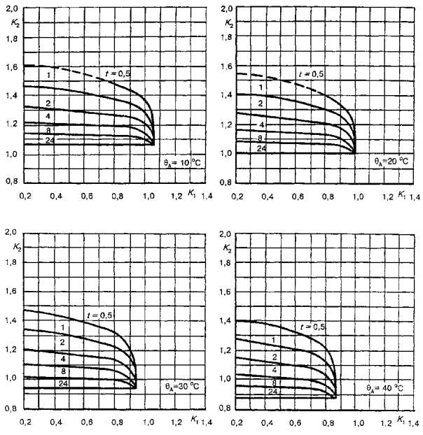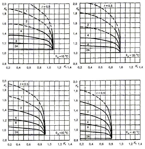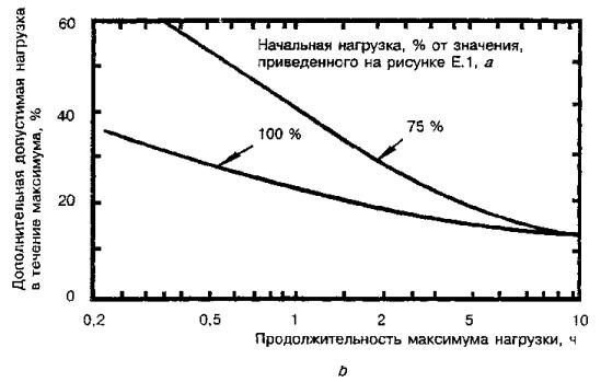 Для трансформаторов малой мощности, называемых здесь распределительными, в стандарте приведены графики определения циклических режимов нагрузки для заданной температуры охлаждающей среды по отношению к номинальным условиям нагрузки при нормальной температуре для трансформаторов, соответствующих ГОСТ 3484.2.