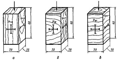 а - вдоль волокон; б - поперекволокон в тангентальном направлении; в- поперек волокон в радиальном направлении