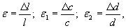 Деформацию образца в продольном (ε)и поперечных направлениях (ε1 и ε2) вычисляют с точностью до 0,0005по формулам: