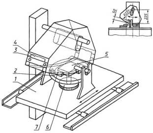 3.4. Образец закрепляют на поворачивающемся диске машины, поджимая винтомподвижный упор приспособления.