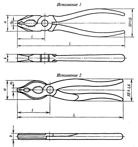 | Примечания: 1. Допускается изготовлять пассатижи 7814-0161 с l = 50 мм, а1 = 26 мм и b = 12 мм. 2. Размеры L и (50 ± 1,6) даны без учета толщины изоляционных и декоративных рукояток, лакокрасочных, резиновых, пластмассовых и других полимерных покрытий. | ||||||||||
