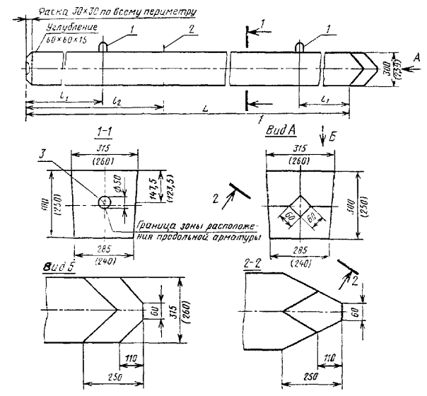 1.1. Формасвай должна соответствовать указанной на черт. 1, марка свай, основные размеры, объем бетона и справочная масса -указанным в таблице.