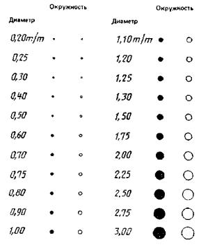 Калибровочная таблица (эталон) представляет собой прозрачнуюпластину размером не менее (100×60)мм, толщиной (0,17±0,05) мм с нанесенными на нее «точками» и «кругами». Рядом с каждой парой «точка-круг»дан их номинальный размер. Диаметр точки больше, а внутренний диаметр «круга»меньше на (0,05±0,025) мм их номинальных размеров.