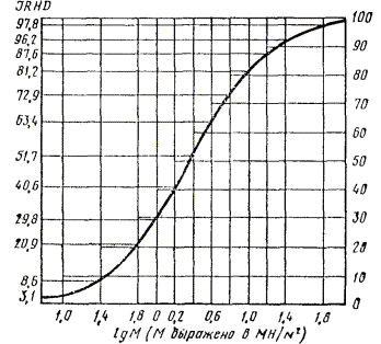 применении вероятностнойкривой (интегрированная зависимость нормального распределения ошибок),связывающей lg М и твердость в единицах IRHD (чертеж). В точке перегиба lg М = 0,364, а максимальныйнаклон равен 57 единиц IRHD на единицу увеличения lg М.