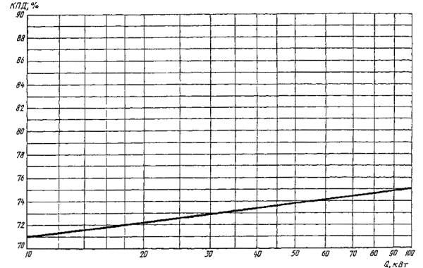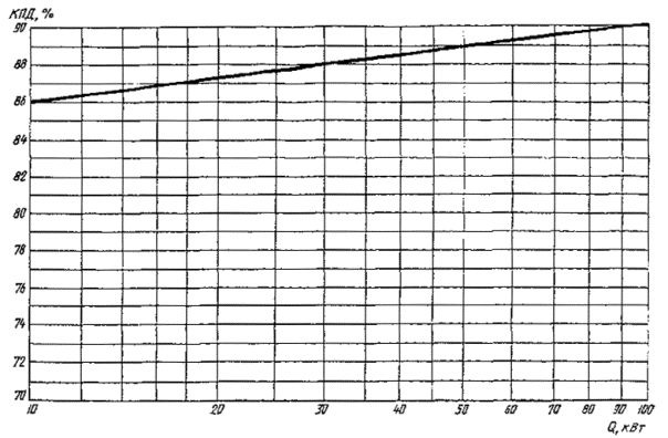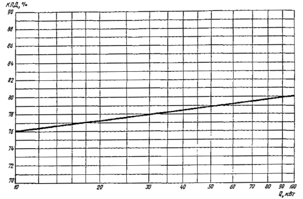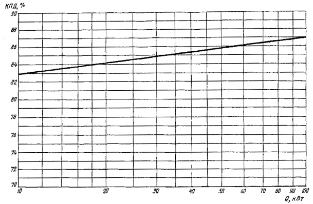 Коэффициентполезного действия котлов, работающих в режиме отопления, должен быть не менееопределенного по графикам на черт. 1 - 5. При оснащении котлаводоподогревателем допускается снижение этого значения не более чем на 2 %.