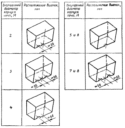 Начерт. 2приведены пять комбинаций выемок, использующихся для маркировки кирпича взависимости от диаметра печи.
