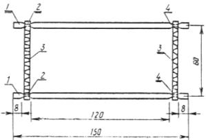 1 - металлические стержни диаметром 5мм; 2 - места расточки стержней додиаметра 3 мм; 3 - резинка-продержка(или стальная пружина); 4 - местапрошивки резинки.