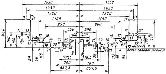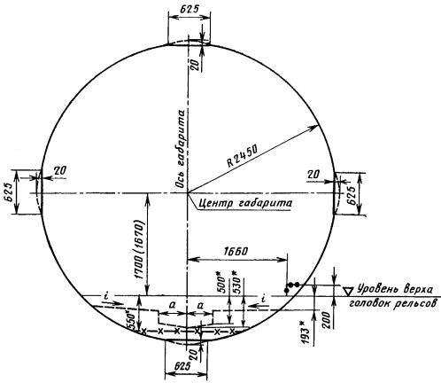 где 1700 (1670) - расстояние от центра габарита до точки, лежащей в плоскости касательной к головкам рельсов посередине пути, соответственно, при рельсах типов Р50 и Р65, мм;