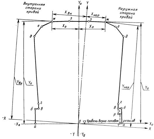 Очертание габарита Смп, расположенное ниже уровня головок рельсов, установлено для прямых и кривых участков пути.