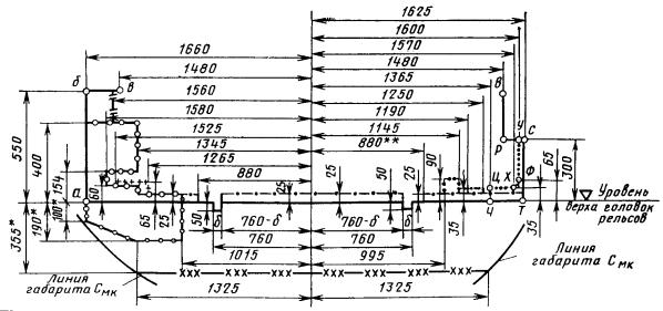 Очертание габарита Смс, расположенное ниже уровня головок рельсов, а также расстояние по горизонтали до линии приближения колонн установлено для прямых и кривых участков пути.