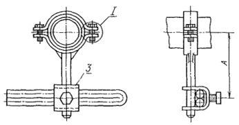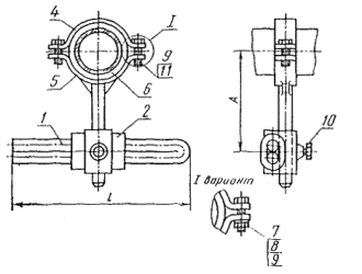 1 -стержень; 2 - ползунок; 3 - скоба; 4 - хомут; 5 -хомут с хвостовиком; 6 - прокладка по ГОСТ 24192-80 ; 7 - болт М6´30.36.016по ГОСТ7798-70 ; 8- гайка M6.4.0.16по ГОСТ5915-70 ; 9- шайба 6.36.01 по ГОСТ 11371-78 ; 10 - болт М8´16.36.016по ГОСТ7798-70 ; 11- болт M6´25.36.016по ГОСТ7798-70