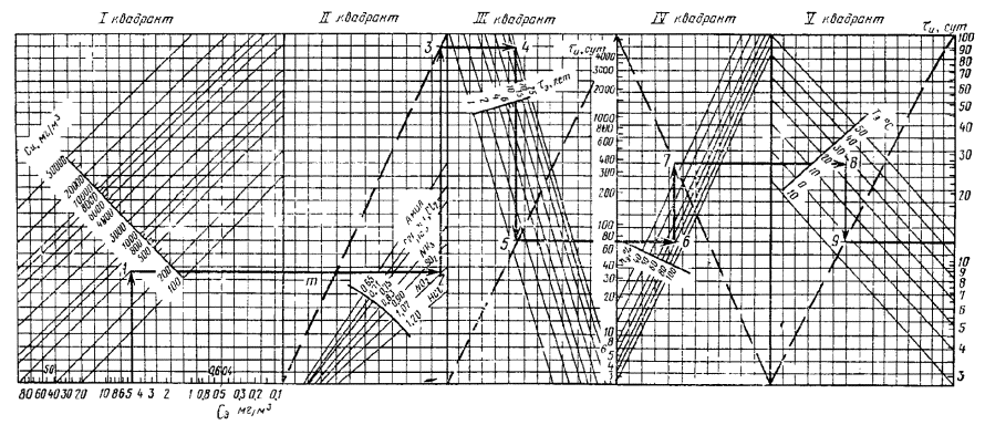 из точки 9проводят горизонталь до пересечения с вертикальной шкалой пятого квадранта, покоторой определяют значение tи. В данном случаепродолжительность испытаний в режиме Ти = (50±2) °C, hи = (98±2) %, Cи = 500 мг/м3составляет tи = 12 сут.
