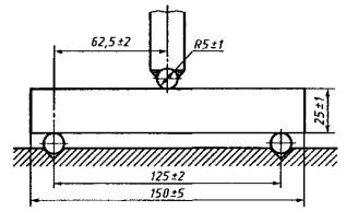Нажимнойстержень должен иметь закругление радиусом (5 ± 1) мм и быть на 5 мм ширеиспытываемого образца. Нажимной стержень должен соприкасаться с образцом всередине между осями опор; допустимое отклонение от середины ± 2 мм.