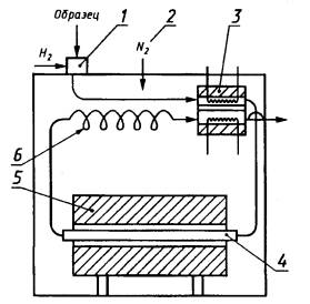 1 - испаритель; 2 - подача инертного газа в термостат; 3 -газохроматографический детектор по теплопроводности; 4 - колонка сцеолитом; 5 - нагреватель; 6 - трубка задержки газа-носителя