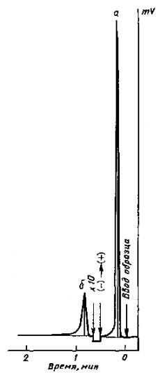 4.6.Микрошприцем вводят в испаритель анализируемую пробу. Типичные хроматограммы, полученныепри анализе жидких парафинов, приведены на черт. 3. Хроматограмму записываюттаким образом, чтобы оба пика выписались между сгибами диаграммной ленты. Послезаписи на хроматограмме пика загрузки (пик а) изменяют полярностьгазохроматографического детектора, чтобы следующий пик (пик б), соответствующийколичеству непоглощенных примесей, записался в ту же сторону. Одновременноувеличивают чувствительность самописца.