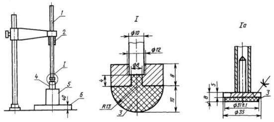 1 - направляющая штанга; 2- боек; 3 - фибровая или текстолитовая пята; 4 - испытуемыйизолятор; 5 - опорная призма массой не менее 10 кг из дерева твердых пород(дуб, граб); 6 - плита стальная