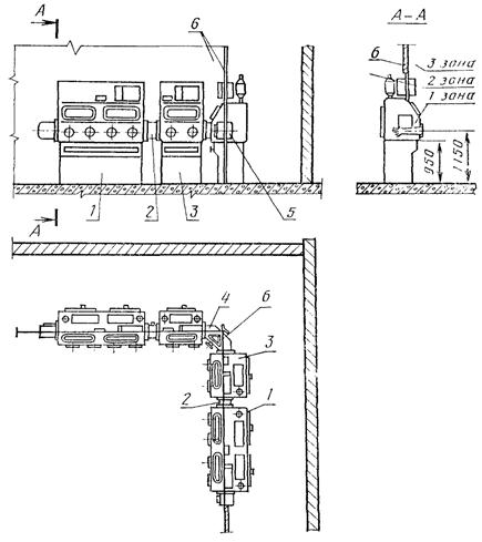 1 - защитный бокс 1БП2; 2 - шлюз промежуточный; 3 - защитный бокс 1БП1; 4 - шлюз промежуточный угловой; 5 - шлюз; 6 - зональная перегородка