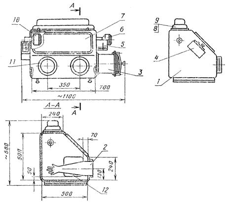 1 - корпус; 2 - перчатки; 3 - шлюз; 4 - пульт управления; 5 - тягонапоромер; 6 - фильтр приточный; 7, 9 - окно по ГОСТ 23410; 8 - светильник; 10 - фильтр вытяжной; 11 - обойма; 12 - люк (К×Л; D)