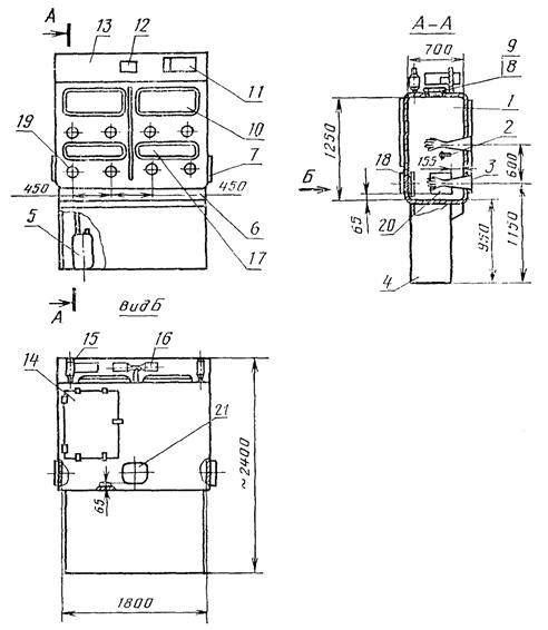 1 - корпус; 2 - душевик-распылитель; 3 - перчатки; 4 - подставка; 5 - сборник жидких отходов; 6 - вентильная панель; 7 - заглушка люка; 8, 10, 17 - окно по ГОСТ 23410; 9 - светильник; 11 - пульт управления; 12 - тягонапоромер; 13 - панель приборов; 14 - монтажная дверь; 15 - фильтр вытяжной; 16 - фильтр приточный; 18 - дверка люка; 19 - обойма; 20 - 2 люка; 21 - люк для транспортера